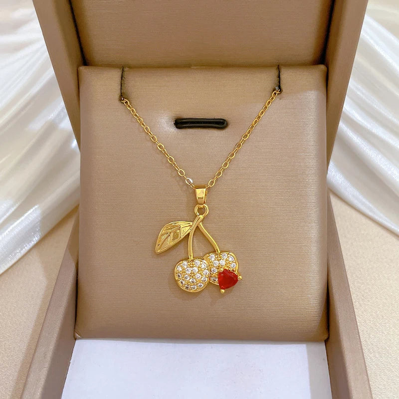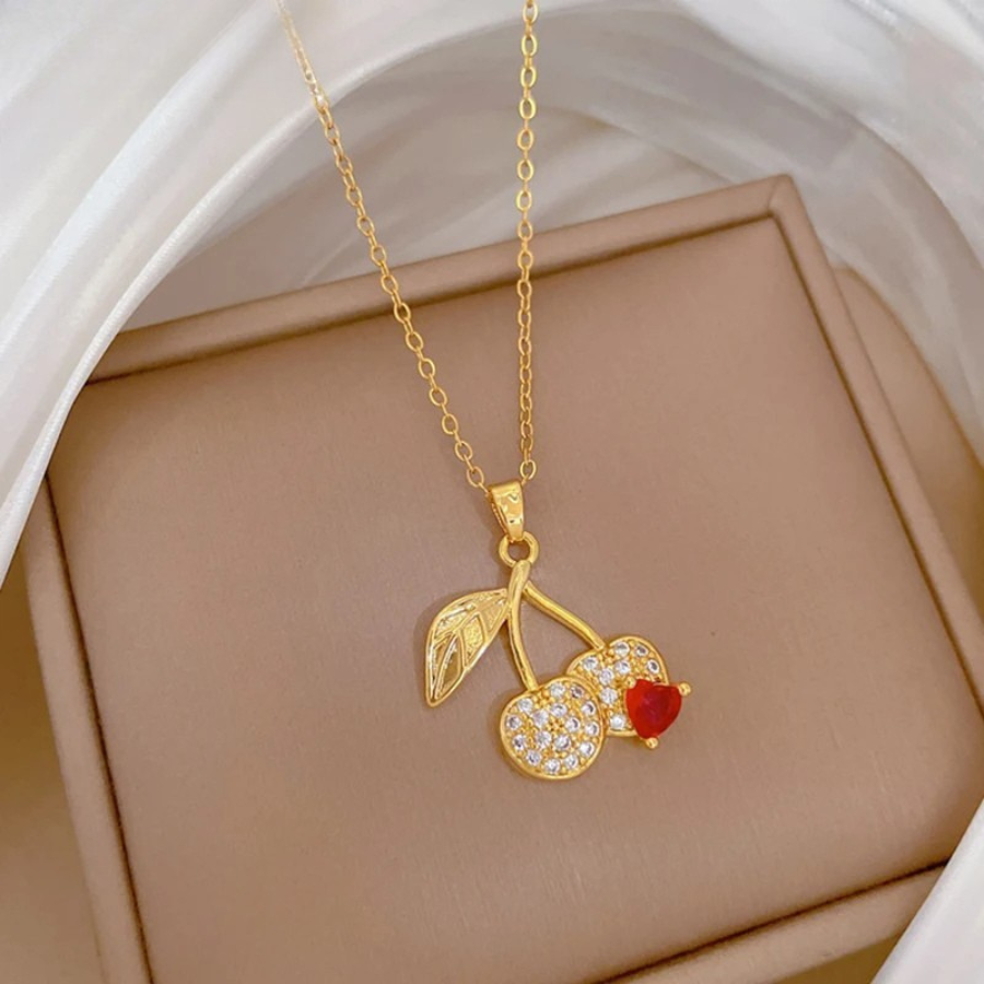 Este elegante collar presenta un delicado diseño de cereza con un corazón adornado con brillantes circones, que aporta un toque de sofisticación y brillo sutil. Perfecto para realzar cualquier atuendo con un detalle femenino y refinado. Collar de 45cm.