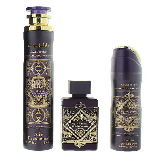 Lattafa Badee Al Oud Amethyst Estuche edp 100ml+200ml Spray+300ml Air Freshener es una fragancia opulenta y cautivadora que viene acompañada de un conjunto exclusivo para una experiencia completa. Este estuche incluye: