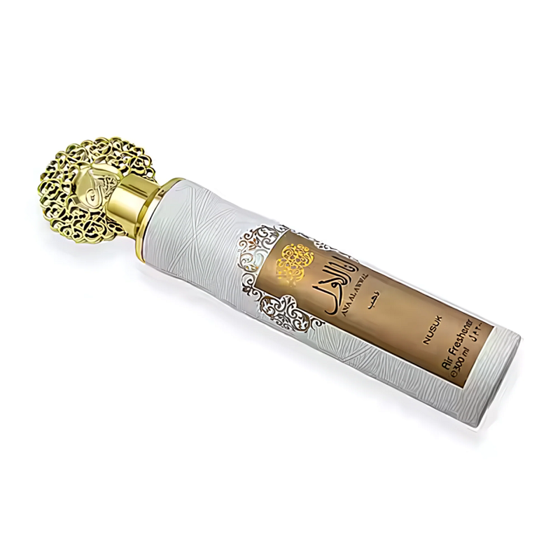 Nusuk Ana Al Awwal Golden Air Freshener es una fragancia radiante y femenina que combina frescura y dulzura con un toque refinado. Su apertura cítrica y jugosa brinda una energía vibrante que se funde con un corazón floral delicado y etéreo. El fondo, cálido y cremoso, aporta profundidad y sensualidad, dejando una estela acogedora y encantadora.