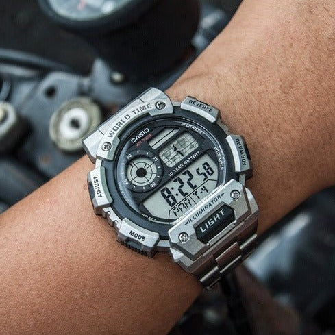 Hora, minuto, segundo; Fecha; Luz LED; Hasta 5 alarmas; Cronómetro 1/100 segundos; Temporizador; Calendario automático completo; Batería dura 10 años.