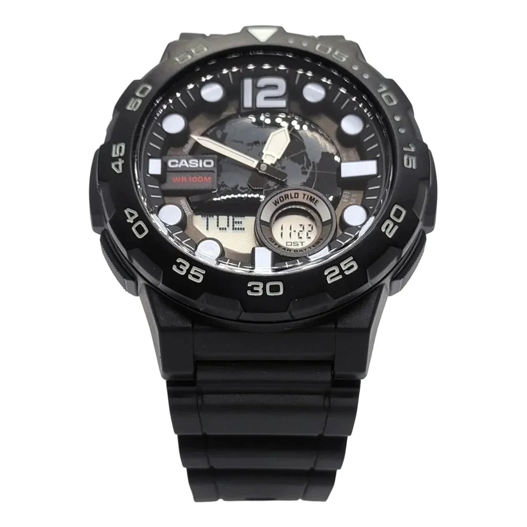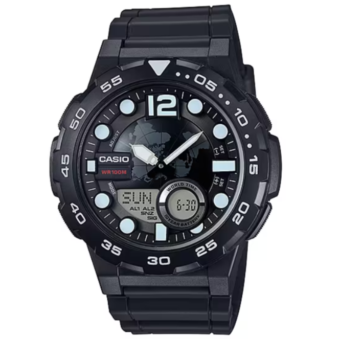 Explora el mundo con el Reloj Casio AEQ-100W-1AV para hombre. Con un diseño único del mapa mundial en su fondo, podrás ver la hora en cualquier parte del mundo gracias a su función de hora mundial. Combina lo moderno con lo tradicional con su pantalla analógica y digital. ¡Un reloj perfecto para los viajeros de corazón!