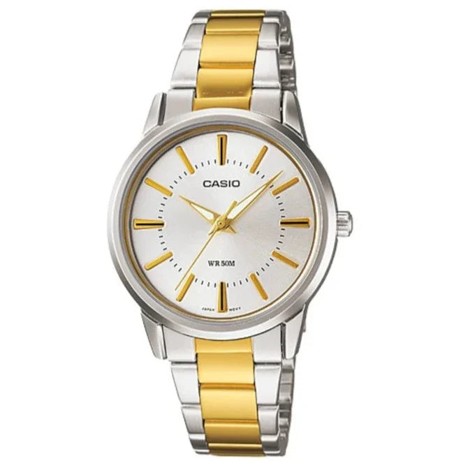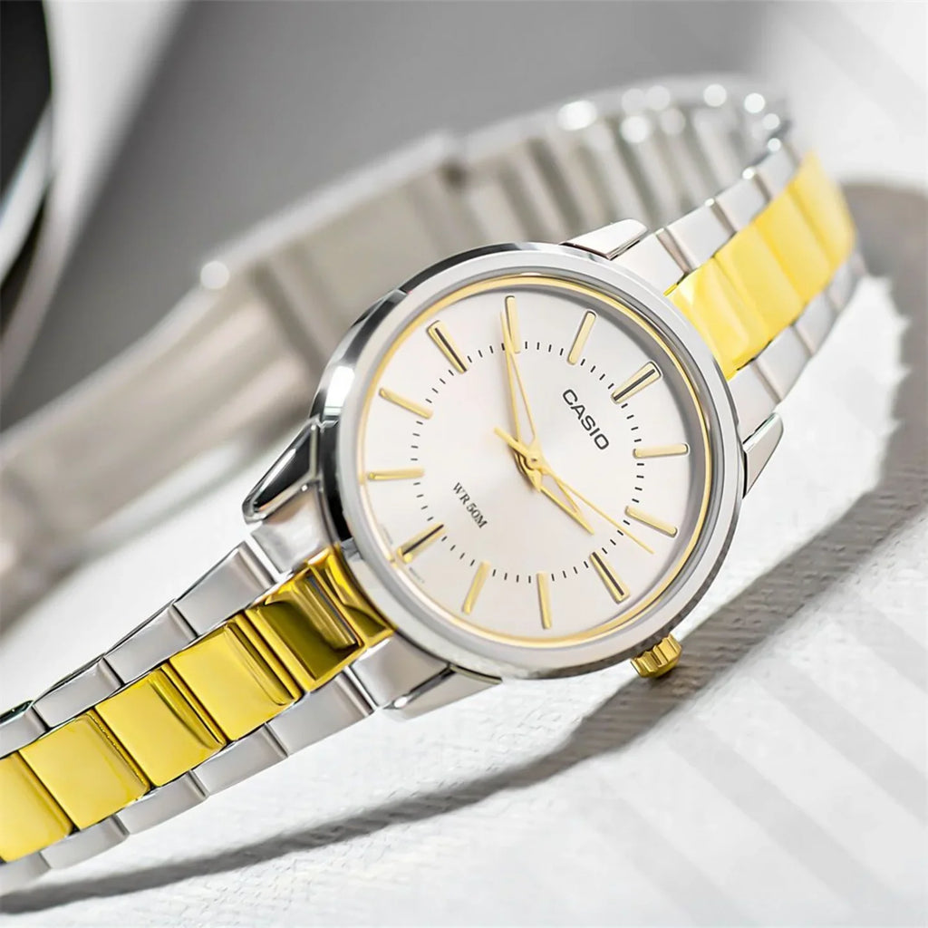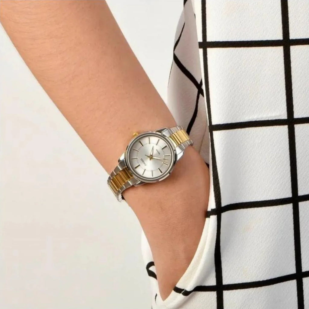 ¡El tiempo se ve más lujoso con el reloj Casio LTP-1303SG-7AV para mujer! Con un elegante diseño en dorado y plateado, este reloj analógico es simple, pero con un toque de lujo. Serás la envidia del tiempo (y guardarás estilo en cualquier momento del día). ¡No más excusas para llegar tarde!