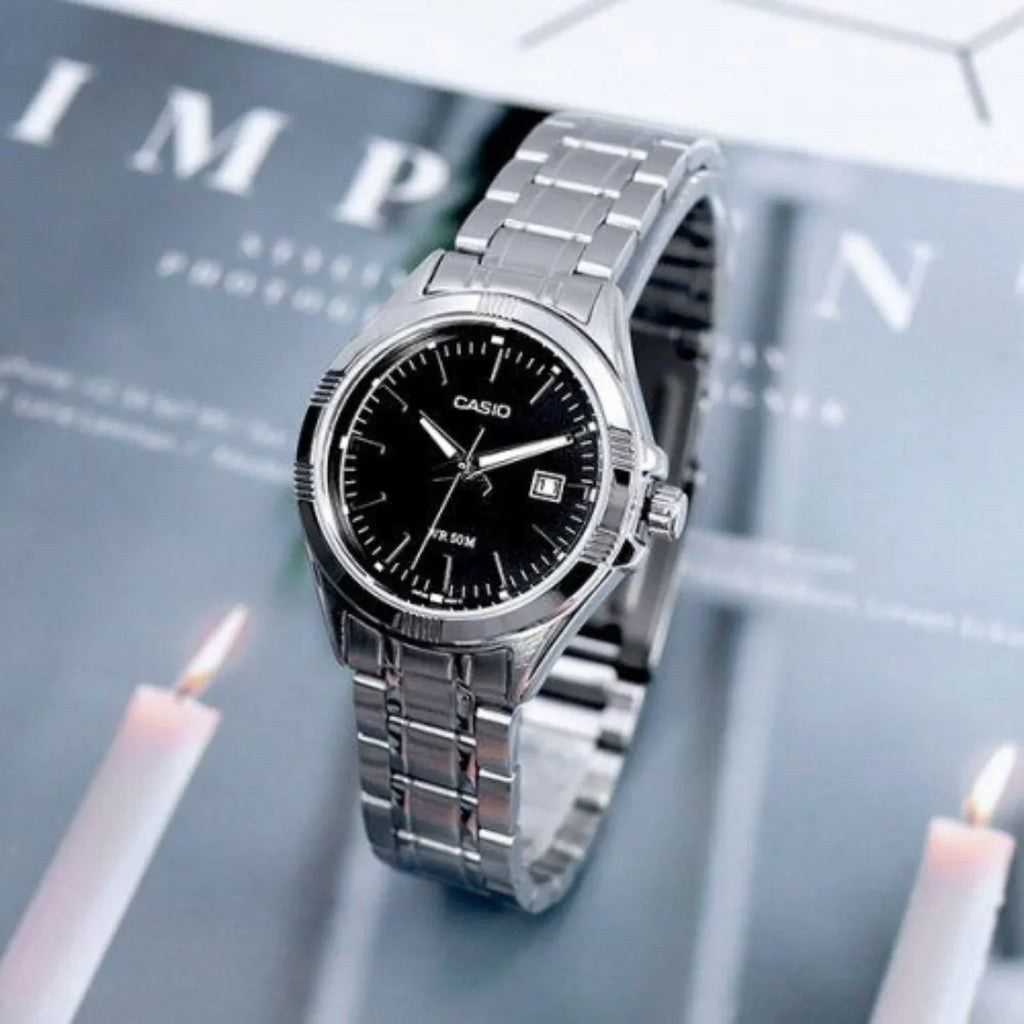 ¡Con este reloj casio LTP-1308D-1AV, siempre estarás a tiempo para cualquier outfit! Su correa pulida y brillante le da ese toque de elegancia, mientras que su fondo negro es perfecto para combinar con cualquier estilo. Además, su función de fecha te mantendrá organizada y puntual.
