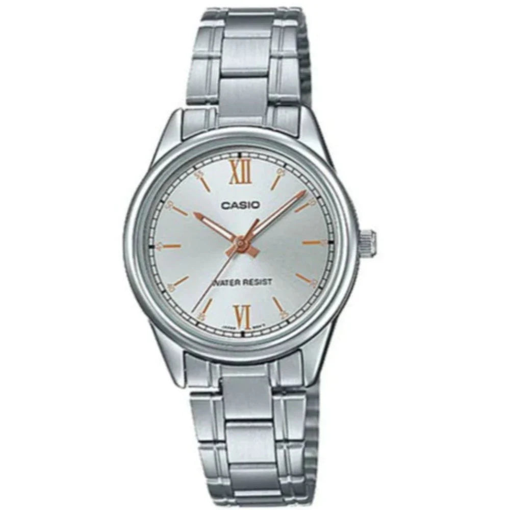 ¡Mantente en estilo con este elegante reloj Casio LTP-V005D-7B2 para mujer! Con su diseño clásico de números romanos y su moderno fondo plateado con marcadores de color cobre, ¡este reloj es perfecto para cualquier ocasión! ¡Descubre lo hermoso que puede ser el tiempo con Casio!