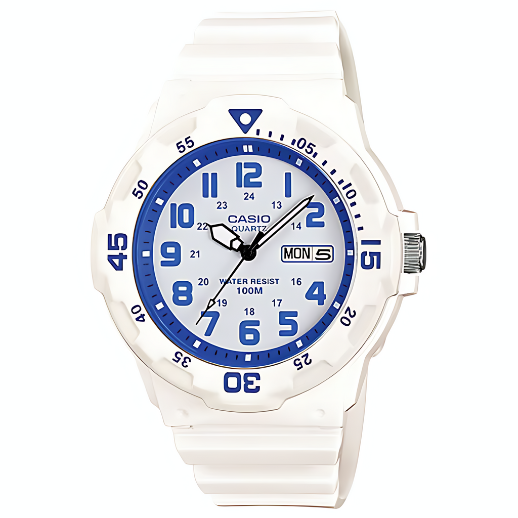 ¡Un reloj deportivo perfecto para hombres activos! El Reloj Casio MRW-200HC-7B2V tiene un diseño casual con correa blanca y fondo blanco. Sus numeros azules le dan un toque único. ¡No pierdas la oportunidad de ser puntual y lucir genial al mismo tiempo!