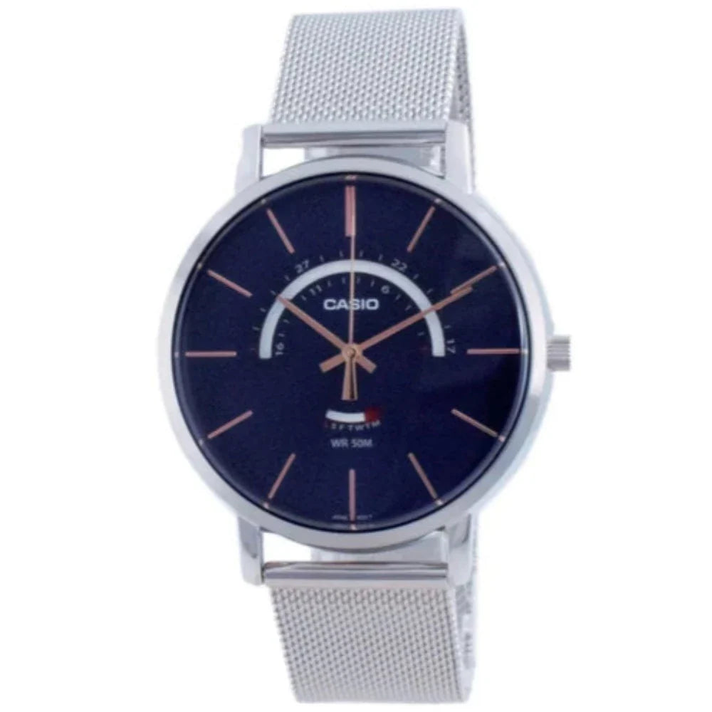 ¡Revisa el tiempo con estilo! Con el reloj Casio MTP-B105M-2AV para hombre tendrás un look minimalista y elegante gracias a su hermoso diseño con fondo azul. Además, su correa tipo malla le da un toque único y moderno. Nunca llegar tarde será tan chic.