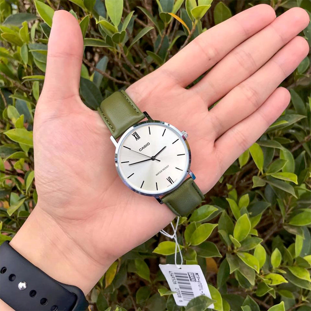 El Reloj Casio MTP-VT01L-3B es perfecto para el hombre moderno y elegante. Con una correa de cuero verde y detalles plateados, este reloj minimalista es hermoso y le dará un toque de estilo a cualquier atuendo. ¡No pierdas la oportunidad de tener este reloj en tu colección!