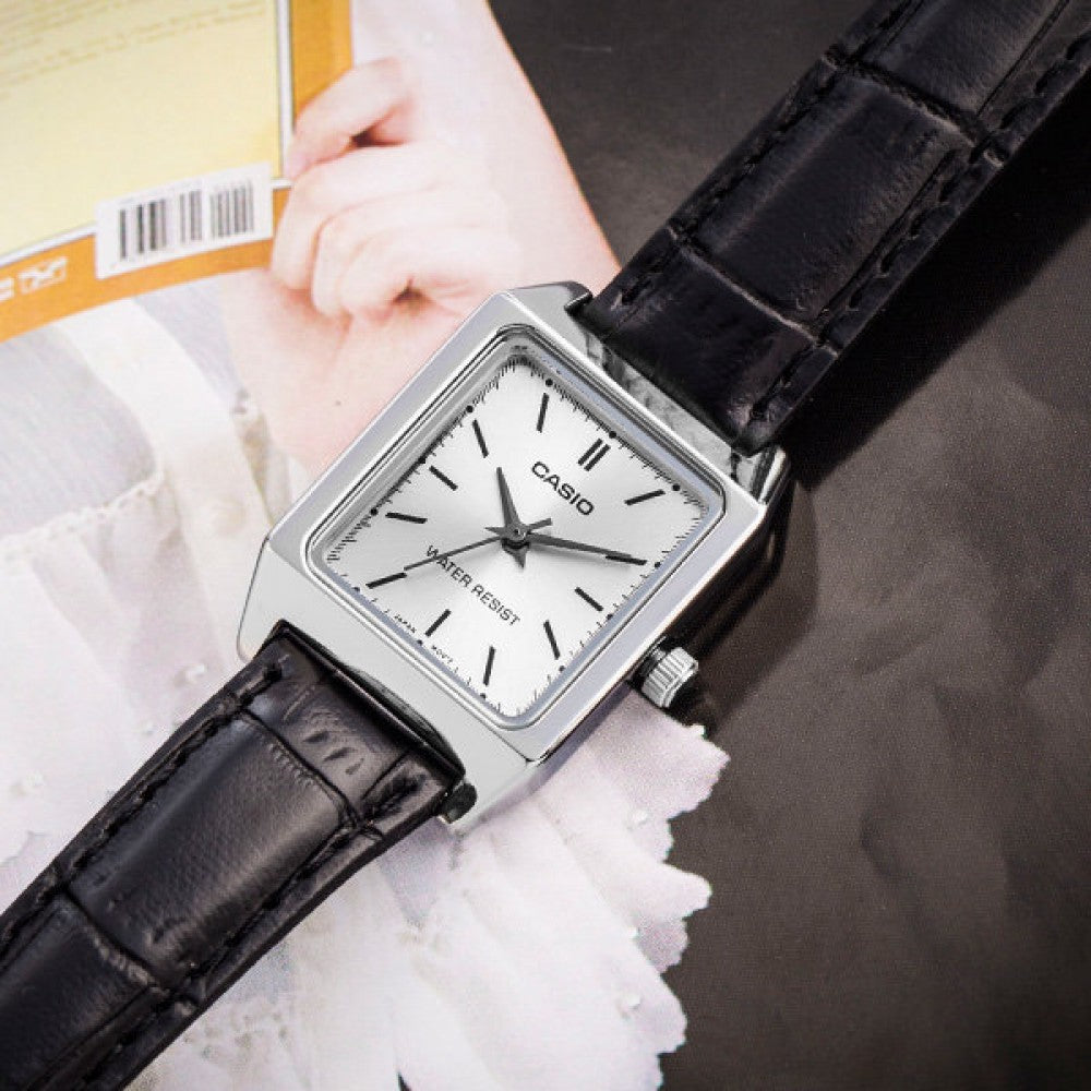 Da un toque de estilo con el reloj Casio Tank LTP-V007L-7E1 para mujer. La correa de cuero negro y el bisel plateado le dan un aspecto minimalista y elegante. Perfecto para cualquier ocasión, ¡te sentirás hermosa con este reloj tank!