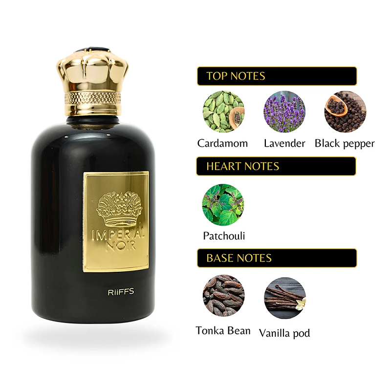 Riiffs Imperial Noir es una fragancia masculina sofisticada y envolvente, diseñada para quienes buscan un aroma intenso y elegante. Su apertura combina un frescor especiado que despierta los sentidos, mientras que el corazón aporta profundidad y carácter. El fondo cálido y suave deja una estela persistente, reflejando presencia y refinamiento.